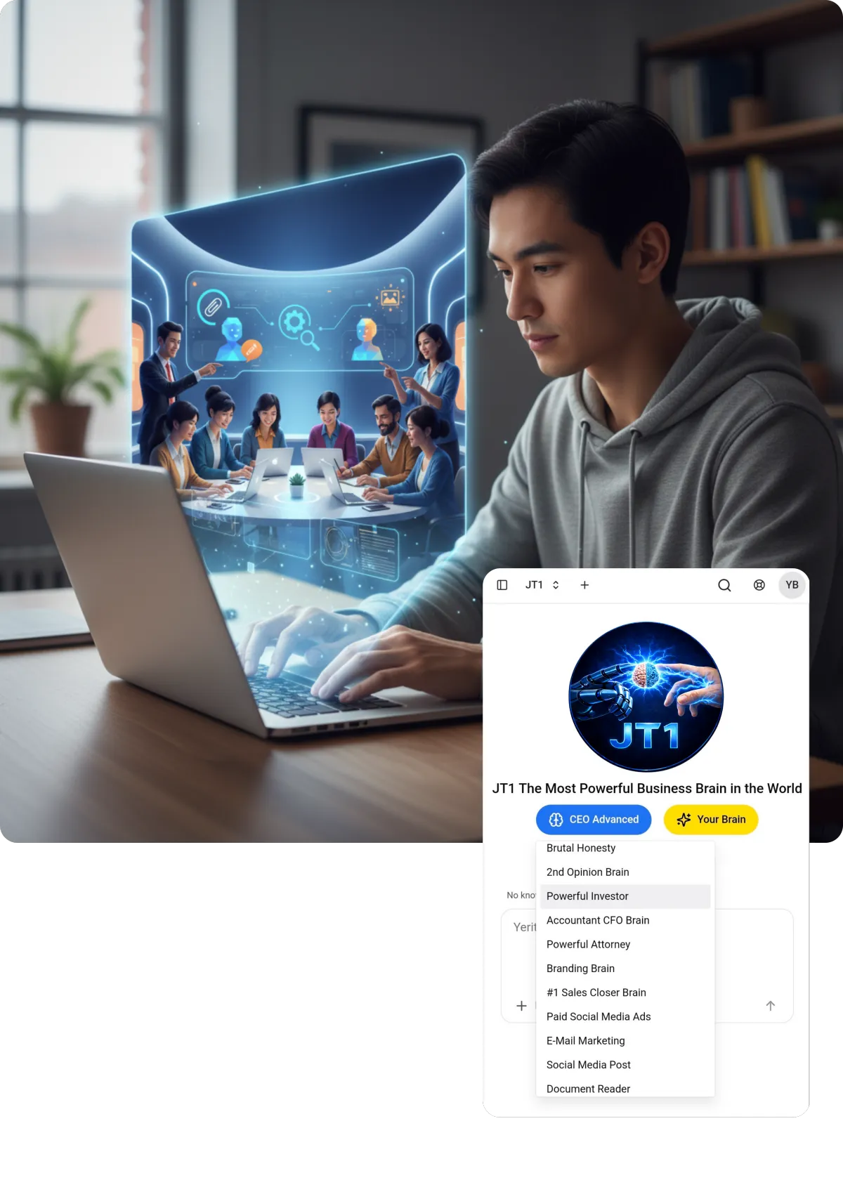 JT1 AI is the most powerful business brain for founders and operators who want speed and precision without losing the identity, meaning, and vision that makes the business worth building. Use it to improve decisions across marketing, operations, finance, and M&A, then bring in Glu Social when you want hands-on execution.